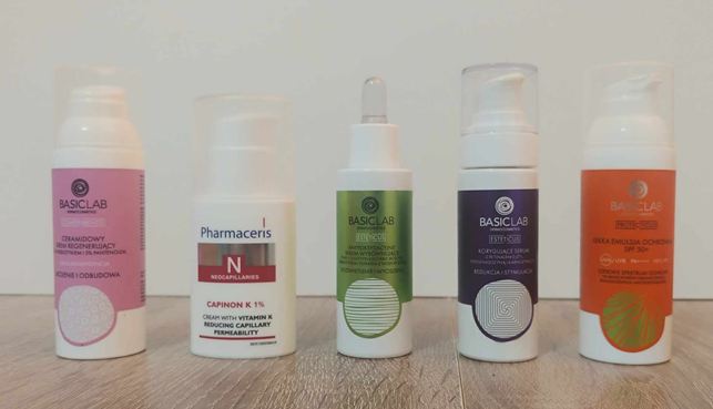 Kosmetyki powinny zawierać w swoim składzie: rutynę, kasztanowiec, algi morskie, krwawnik pospolity, arnikę górską, kwas laktobionowy, wit C, PP, K, miłorząb japoński, wyciąg z lipy, rumianek